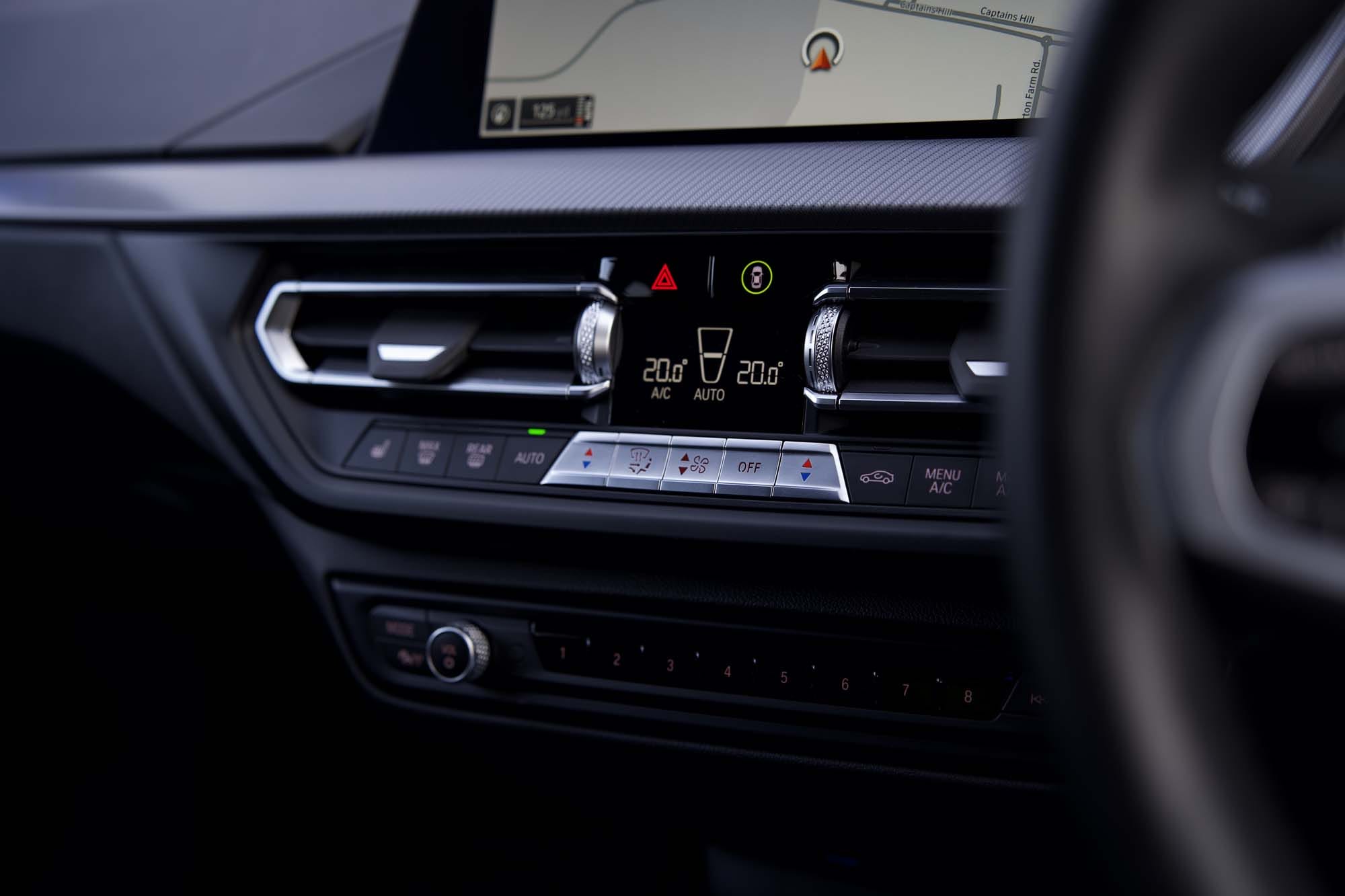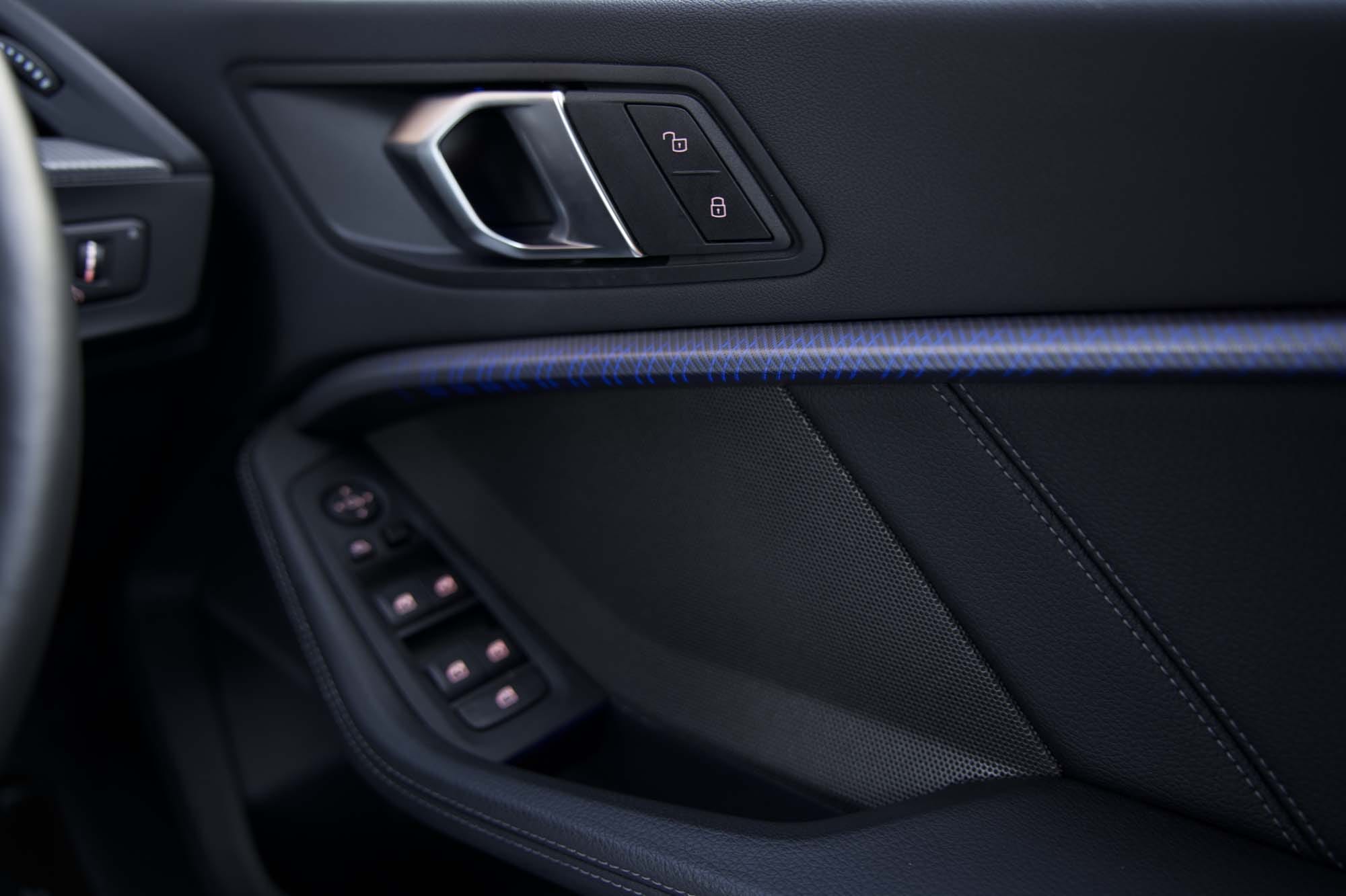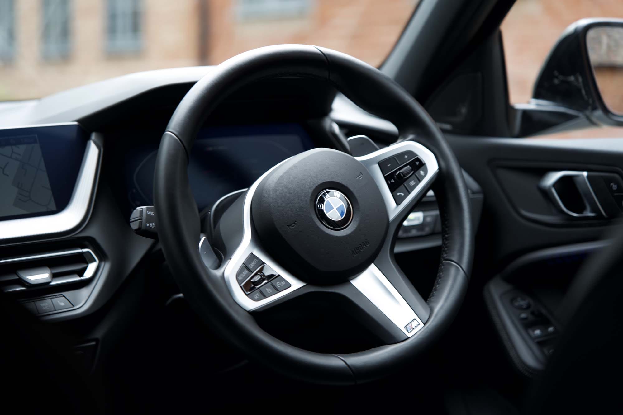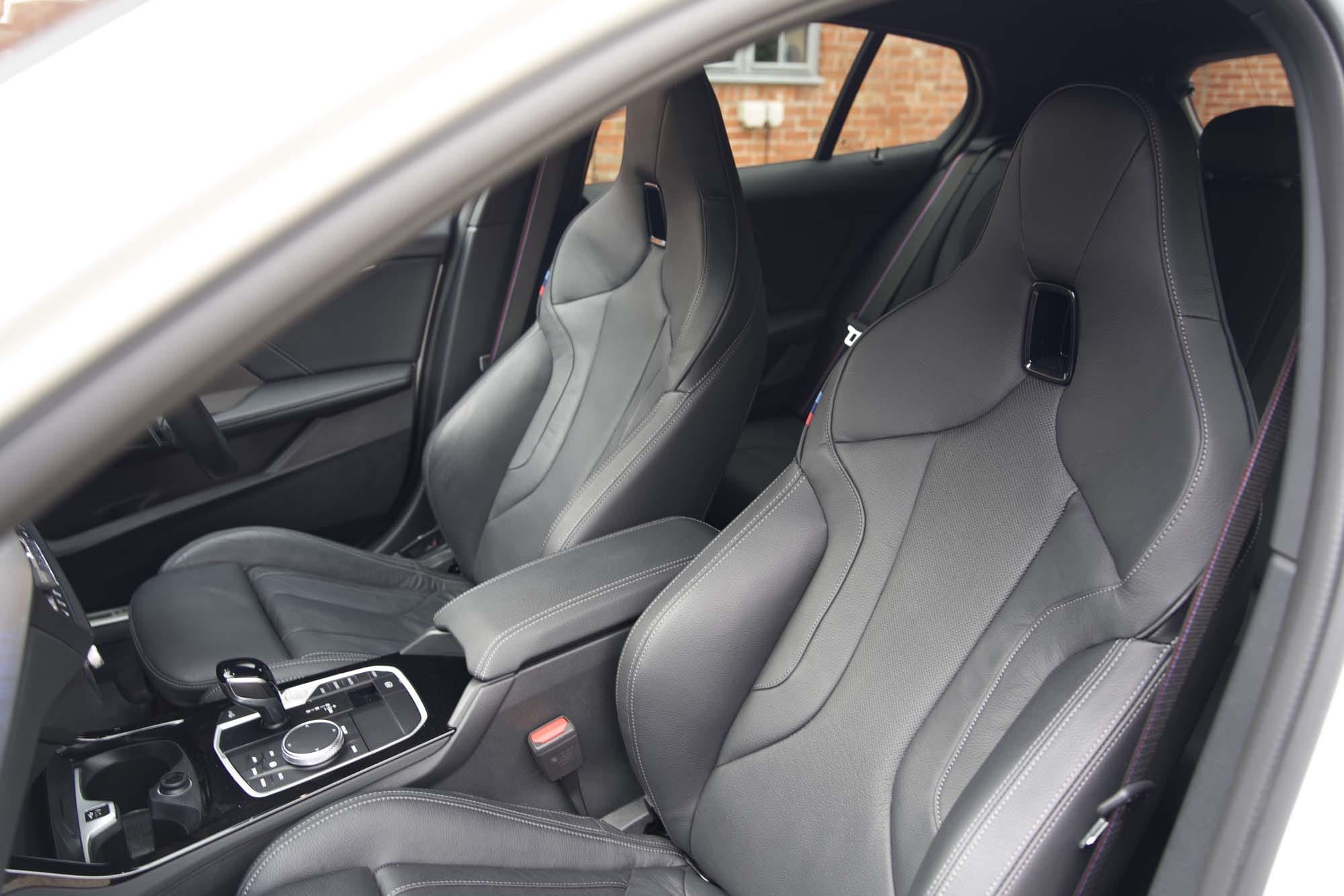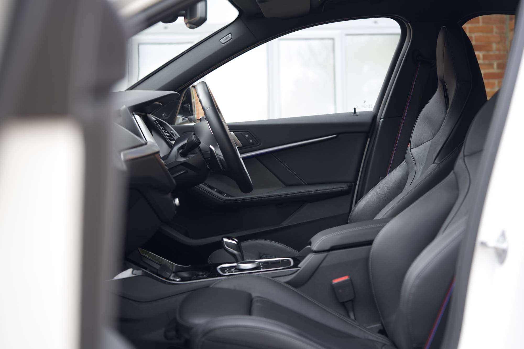 The M135i’s sculpted bodywork is accented by Cerium Grey M Performance exterior elements, dual exhaust outlets, aerodynamic styling, and the signature BMW mesh kidney grille. Inside, the cabin blends premium quality with sporting intent, offering M Sport seats in Black Dakota Leather.