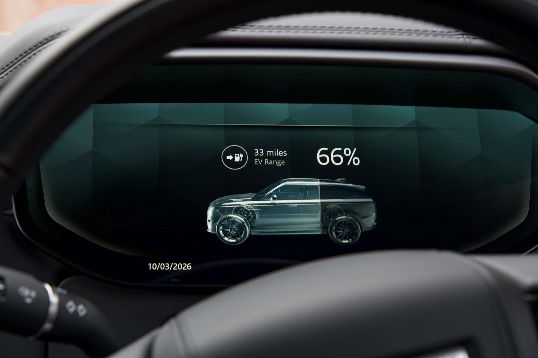 The 38.2 kWh battery allows the Range Rover Sport to travel up to around 70 miles on electric power alone, making it ideal for silent, zero emission daily commuting or city driving, while the petrol engine ensures effortless long distance capability when required. Charging can be completed in around 5 hours in the standard 3 pin home socket.